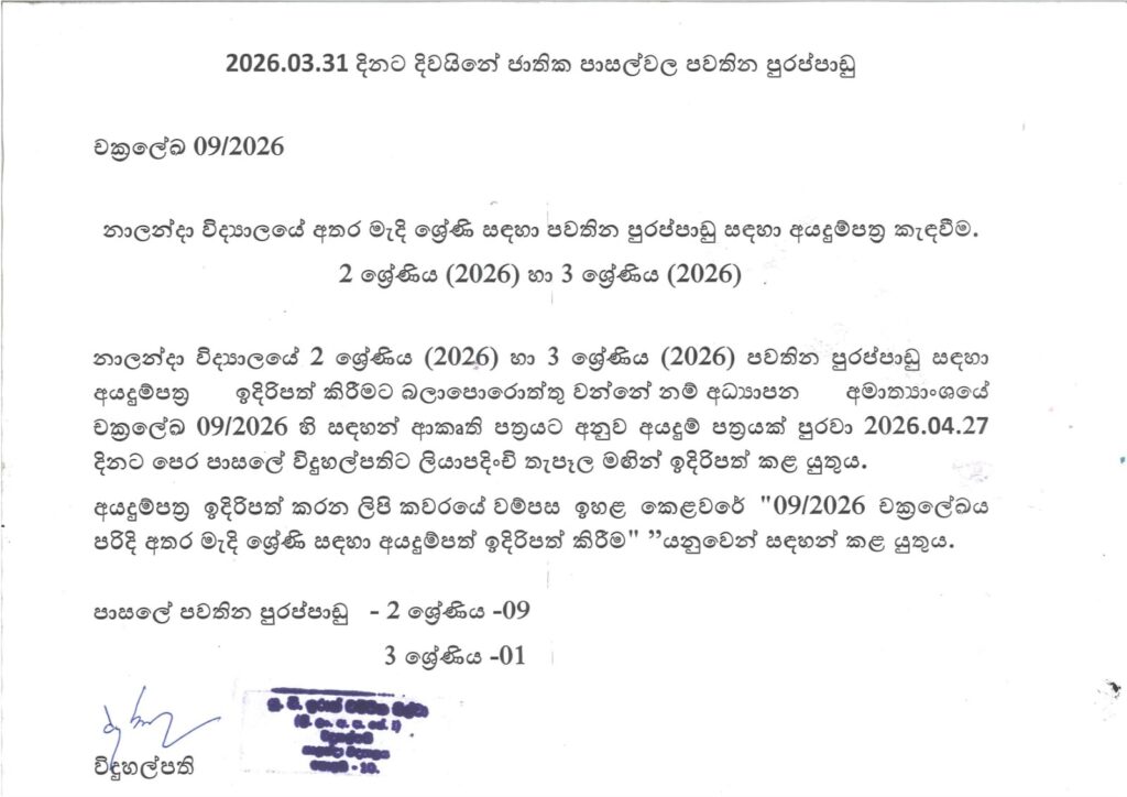 නාලන්දා විද්යාලයේ අතරමැදි ශ්රේණි සඳහා පවතින පුරප්පාඩු සඳහා අයදුම්පත් කැඳවීම